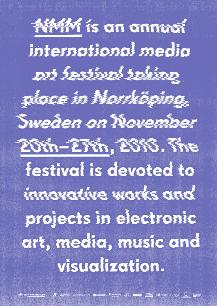 New Media Meeting was an annual festival in Norrköping that brought together around 50 international artists, hackers, DJs, VJs, researchers, and activists. The festival offered a weekend of workshops, concerts, exhibitions, and lectures, focusing on new electronic art and culture. It was a meeting place for inspiration, fresh ideas, and creative experimentation, celebrating the intersection of technology and artistic expression.