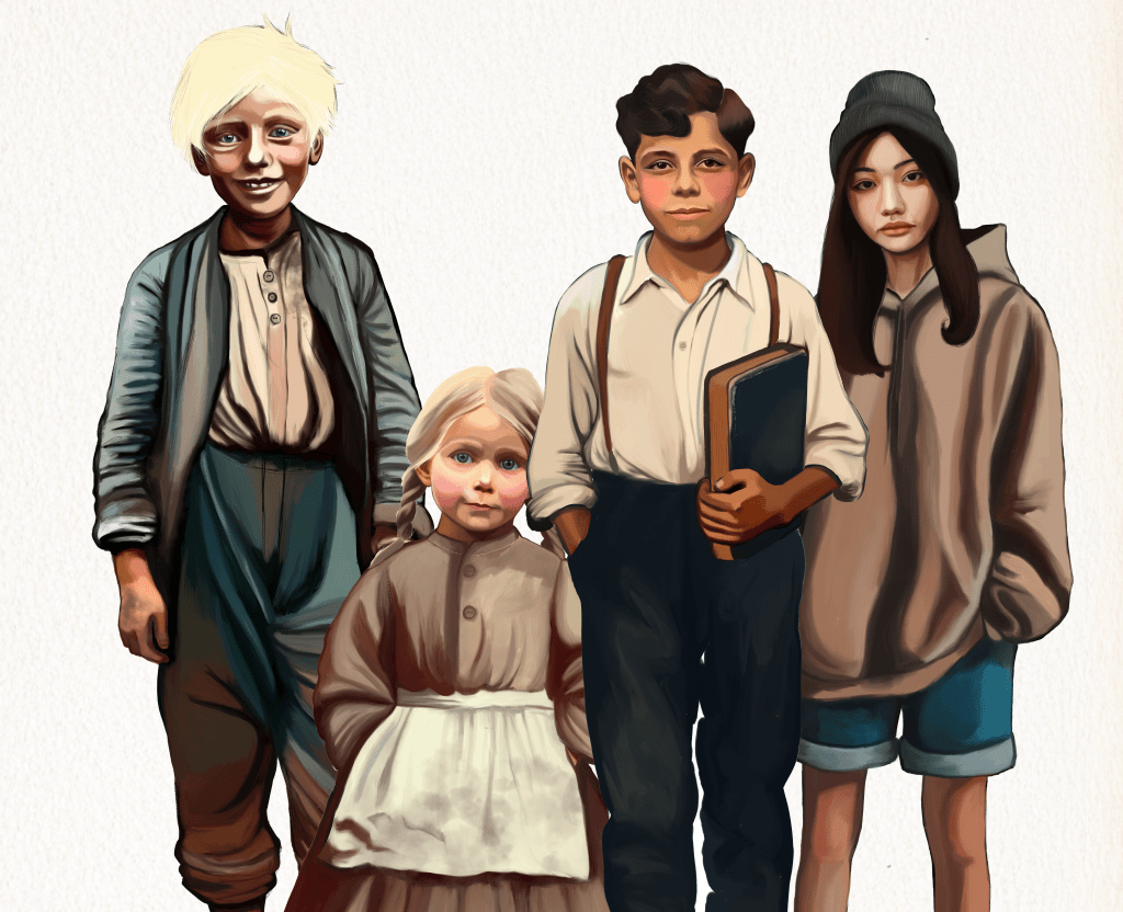 Illustration: Children from different times, for exhibition at Åtvidaberg’s Museum.